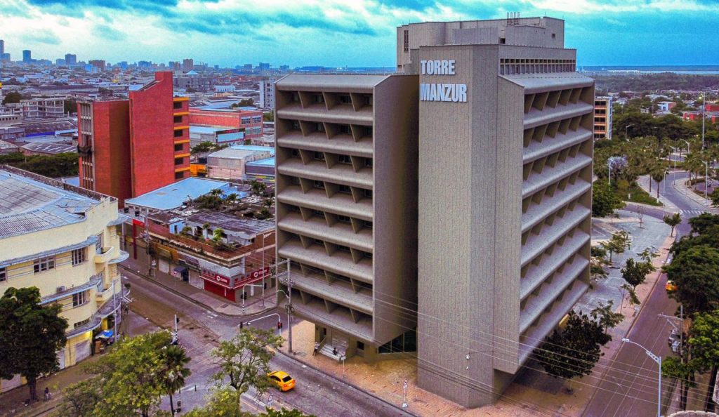 Edificio de la Caja Agraria, diseñado por Fernando Martínez Sanabria luego de ganar el concurso en 1961 con una propuesta audaz que reunía parámetros urbanos para configurar el espacio interior. El edificio fue terminado de construir en 1962.